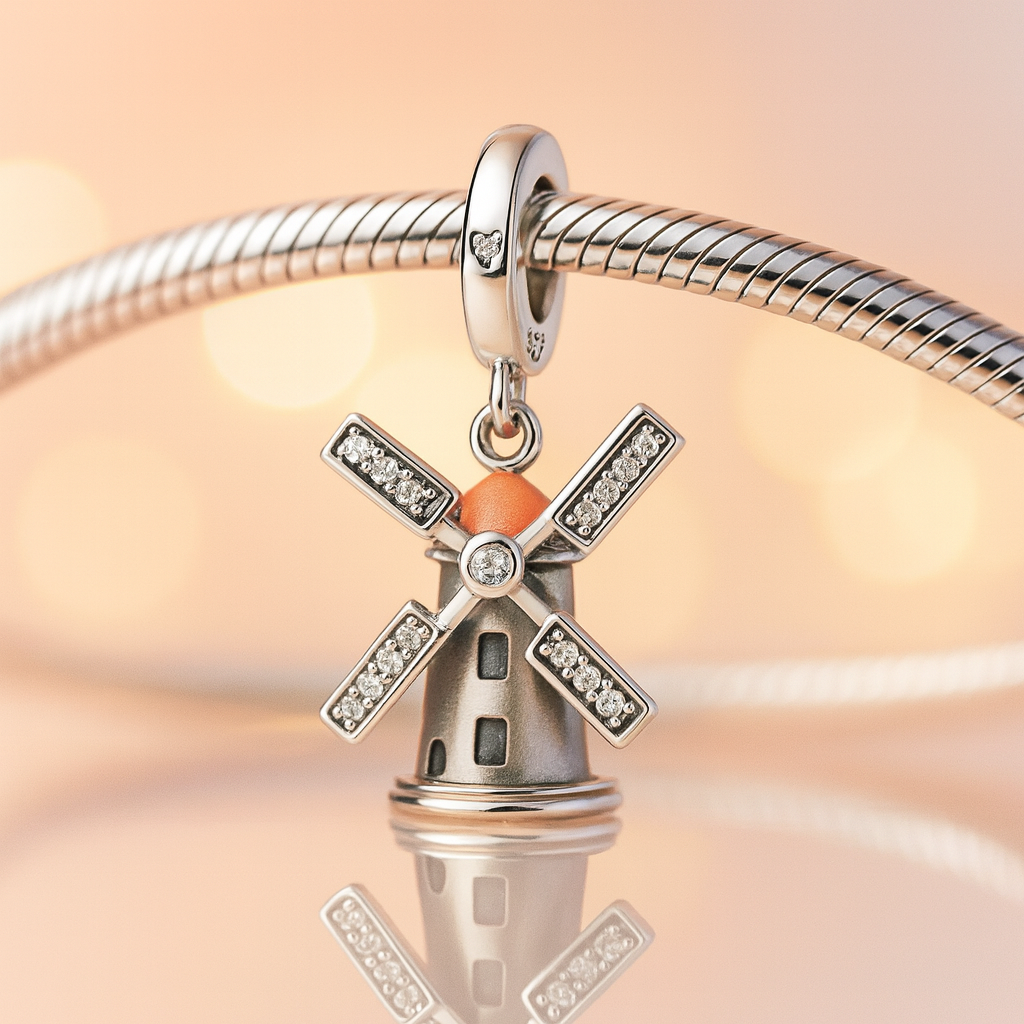 Crafted in lustrous 925 sterling silver, this dangle charm captures the soul of the Netherlands in every detail: a graceful windmill cloaked in warm brown enamel, its blades crowned with sparkling white zircons. With each gentle turn, it carries you back to sunlit canals, fragrant tulip fields, and breezy bicycle rides down cobblestone streets. Wear it close to your heart and let it whisper your story—one cherished memory, one adventure at a time. Your journey. Your bracelet. Your keepsake.