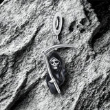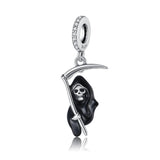 925 Sterling Silver dangle charm featuring a scary Halloween Grim Reaper, wearing a black hooded cloak and holding a curved blade scythe. Designed with smooth black enamel and sparkling white zircon gemstones on the charm's ring.
